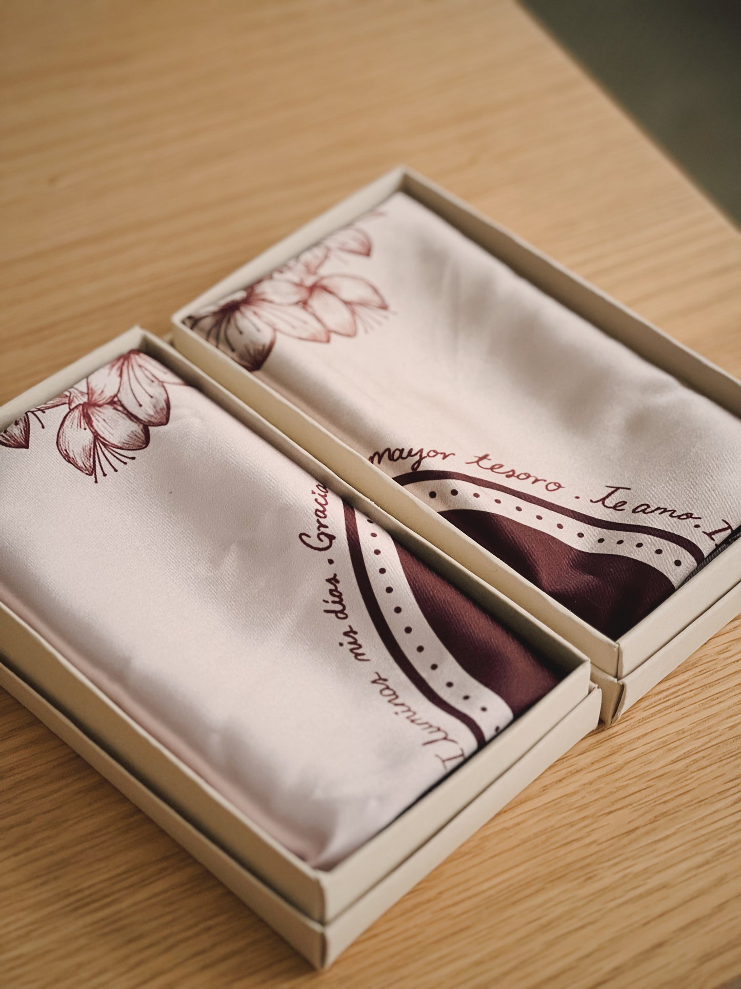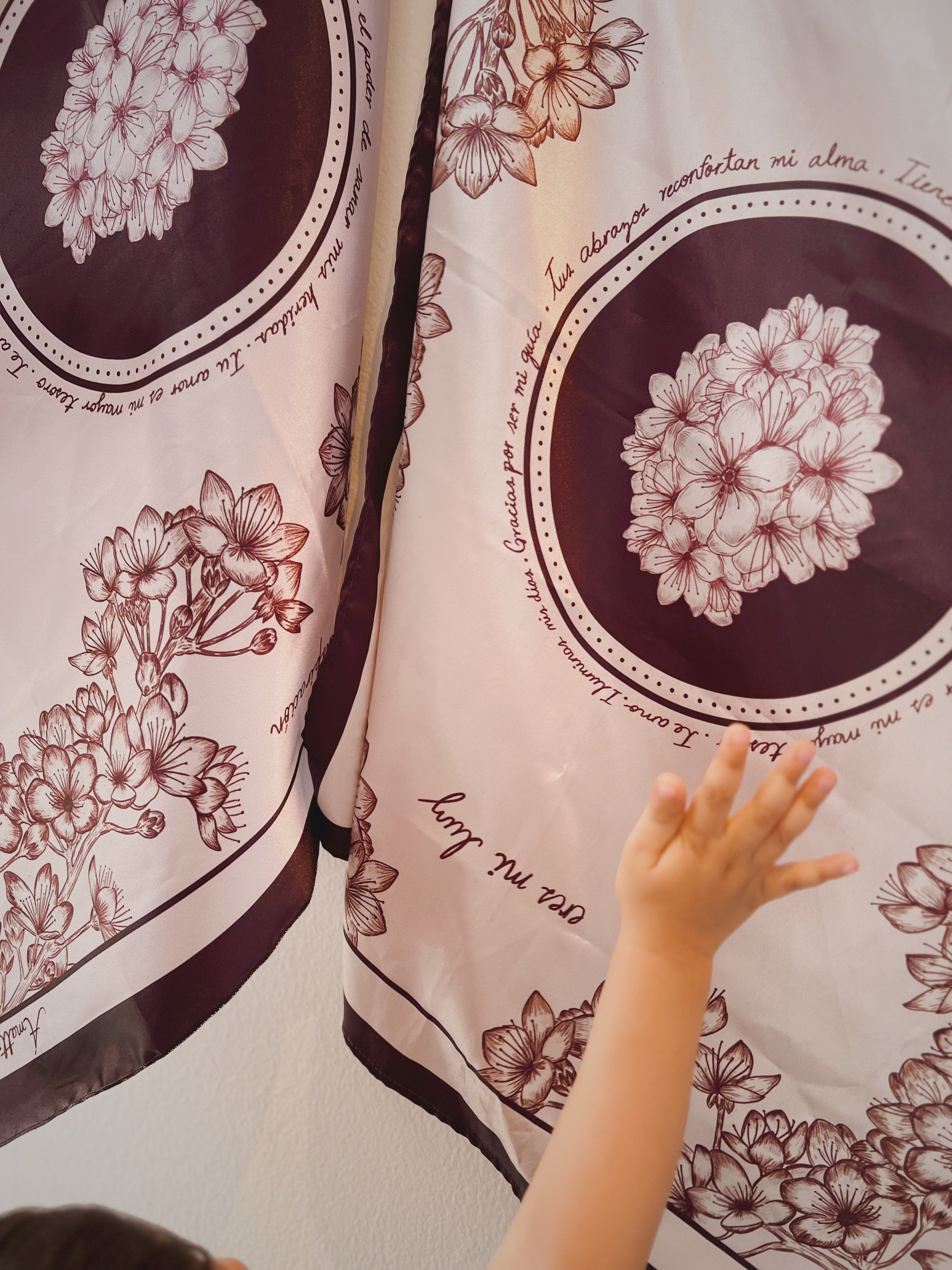 Pañoleta en seda satinada de 70x70 cm, ilustrada por Delirio de Color y hecha 100% en Cali, Colombia.